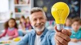 Teacher holding a bright yellow light bulb in a classroom of children