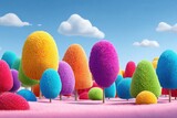 Colorful field of whimsical textured trees under a serene blue sky