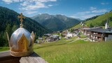Golden bishop's mitre displayed with scenic alpine village and mountain views