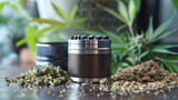 Sleek portable cannabis grinder on a reflective surface next to ground weed