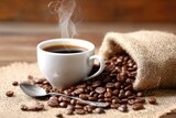 Aromatic Coffee Cup With Steam And Roasted Beans In Burlap Sack On Wooden Table Perfect For Morning Drink And Concepts
