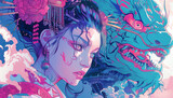 Anime style illustration of an Oni and a Geisha in a vibrant fantasy setting