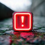 Neon red warning sign icon glowing on a frosty stone surface outdoors in a dramatic close-up