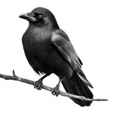 Black crow perched on a branch with a detailed close-up view