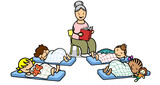 Erzieherin liest Buch vor beim Mittagsschlaf in der Kita