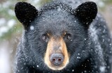 Close up of a black bear in snowfall with intense eyes, a stunning winter wildlife portrait