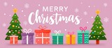 Colorful Christmas gifts and trees with festive decorations on pink background