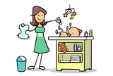 Cartoon Mutter wickelt Baby mit frischer Windel und Babypuder