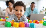 Happy baby boy plays with colorful building blocks at home with family in the background