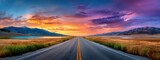 Scenic Highway Road Trip at Colorful Sunset With Mountains Lake and Grassland Landscape Travel Destination and Transportation Concept