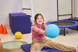 Happy girl doing rehabilitation exercises with a ball in a pediatric physical therapy session, child physiotherapy, motor skills training in a rehabilitation center