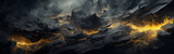 Epic landscape of dramatic cliffs with fiery lava cracks under dark sky