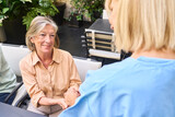 Senioren machen Smalltalk bei einer Tasse Kaffee im Aufenthaltsraum im Altersheim