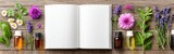 Open Blank Book With Essential Oil Bottles Flowers Herbs On Rustic Wood Background For Aromatherapy And Alternative Medicine Concepts