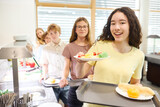 Students enjoying healthy meals in a brightly lit school cafeteria line