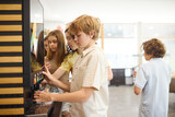 School children filling beverages in cafeteria during a lunch break