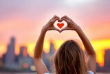 Woman Making Heart Shape With Hands At Sunset Over City Skyline For Romance; Love; Valentines Day And Romantic Getaways Concepts