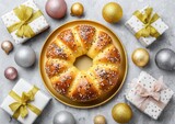 Christmas Bread Wreath On Golden Plate With Gifts And Ornaments Holiday Table Setting Festive Background