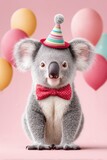 Cute koala wearing party hat and bow tie surrounded by balloons