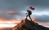 Hiker Reaching Mountain Peak Holding Flag Backlit by Stunning Sunrise
