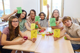 Students displaying food illustrations in a school cafeteria environment with fresh produce