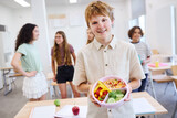 Students enjoying healthy snacks together in a vibrant school cafeteria setting