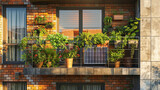 Eco-friendly urban balcony garden with solar panel during sunset