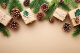 Festive Christmas gift boxes and pine cones arranged with evergreen branches and twine
