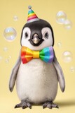 Cute penguin chick wearing a rainbow bow tie and colorful party hat