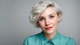 Elegant Swedish woman in her sixties with stylish platinum hair against a turquoise background