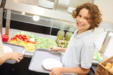 Smiling child selecting food in a school cafeteria with a fresh salad bar