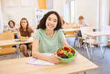 Smiling student holding healthy fruit bowl during class in a bright classroom
