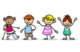 Vier Cartoon Kita Kinder stehen nebeneinander in Reihe