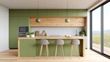Modern minimalist kitchen with olive green cabinets, wooden accents, and a bright open space