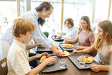 Children enjoying healthy meals together in the school cafeteria with supervision