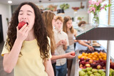 Students enjoying fresh fruits in a vibrant school cafeteria