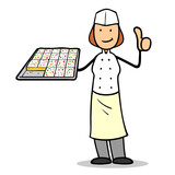 Cartoon Frau als Konditorin oder Bäckerin hält Blech mit Kuchen