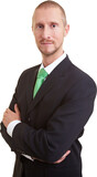Junger Mann steht halb im Anzug und halb im Blaumann vor Tafel mit Muskel Armen