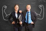 Zwei Berater oder Dozenten vor Tafel mit Muskel Armen als Business Konzept