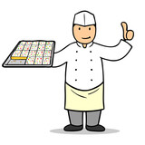 Cartoon Bäcker mit einem Blech Kuchen hält den Daumen hoch