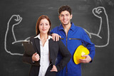 Junge Geschäftsfrau und Handwerker vor Tafel mit Muskel Armen