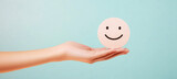 Smiling face icon rested on a hand with a pastel background