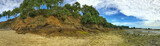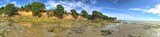 Panorama of a scenic beach with seaweed under a sunny cloudy sky