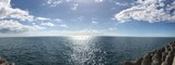 Sunny day panoramic view of ocean horizon with calm waters and clear sky