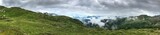 Panoramic view of lush green hills with misty mountains under cloudy skies