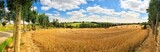 Idyllic panoramic view of a farmland under dramatic clouds and blue sky