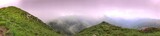 Wide panorama of a lush green valley under a pinkish cloudy sky