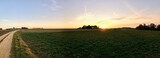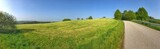 Wide panoramic view of a sunny meadow under a vibrant sky