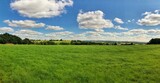 Panoramic view of a green field with a blue sky and fluffy clouds