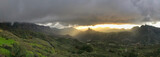 Panoramic view of a mountain landscape with a dramatic cloudy sky